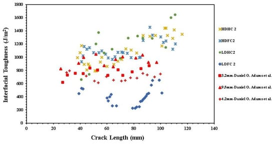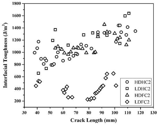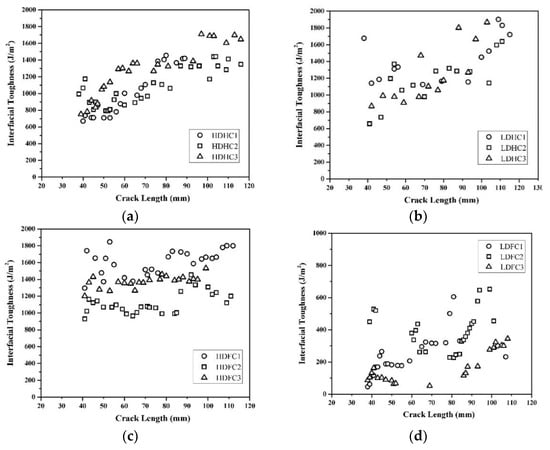 The interlaminar fracture toughness of the SCB specimens was calculated using the Equation (8). The debond resistance curve ( vs. a) is plotted for all four sandwich systems with three specimens each (Figure 13).