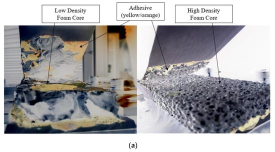 On the other hand, the load-displacement curves of the HDFC exhibited an initial sharp increase followed by a gradual decrease with displacement. This gradual decrease was due to the homogenous nature of the foam core with closely clustered pores. This smooth gradual decrease is very much evident in the high-density foam core but is different for the LDFC. In LDFC, there was an arbitrary increase and decrease in load, which was due to the non-uniform and chaotic presence of large cells on the surface of the foam core, as shown in Figure 4.
