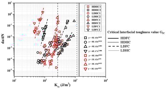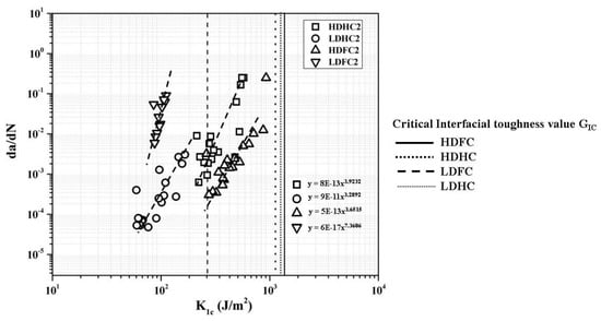 From the fatigue test, the change in compliance over a cycle was plotted against GImax to generate the Paris law for the steady-state region II using power-law curve fitting tools on Microsoft Excel. The Paris law response for the different material configurations is plotted in Figure 18. The average critical interfacial toughness (GIC) values of each specimen type are also plotted to define Region III (Gmax), at which the crack attains an asymptotic G value.
