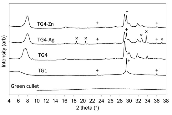 XRD patterns of green cullet and hydrothermal products of green cullet and calcium oxide in 1 M NaOH(aq) (TG1) or 4 M NaOH(aq) (TG4), and Ag+-exchanged TG4 (TG4-Ag) and Zn2+-exchanged TG4 (TG4-Zn). Key: + calcite; × silver carbonate; all other reflections arise from tobermorite.