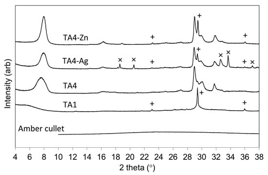 XRD patterns of amber cullet and hydrothermal products of amber cullet and calcium oxide in 1 M NaOH(aq) (TA1) or 4 M NaOH(aq) (TA4), and Ag+-exchanged TA4 (TA4-Ag) and Zn2+-exchanged TA4 (TA4-Zn). Key: + calcite; × silver carbonate; all other reflections arise from tobermorite.