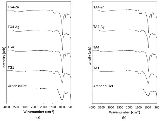 FTIR spectra of (a) green cullet and hydrothermal products of green cullet and calcium oxide in 1 M NaOH(aq) (TG1) or 4 M NaOH(aq) (TG4), and Ag+-exchanged TG4 (TG4-Ag) and Zn2+-exchanged TG4 (TG4-Zn); and FTIR spectra of (b) amber cullet and hydrothermal products of amber cullet and calcium oxide in 1 M NaOH(aq) (TA1) or 4 M NaOH(aq) (TA4), and Ag+-exchanged TA4 (TA4-Ag) and Zn2+-exchanged TA4 (TA4-Zn).