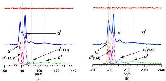 29Si MAS NMR spectra of (a) tobermorite product TG4 and (b) tobermorite product TA4. The calculated spectra are depicted as continuous royal blue lines superimposed over the experimental spectra (shown in black). The individually resolved resonances are presented as dashed lines. The residual between the calculated and experimental spectra is shown in red above the spectra.