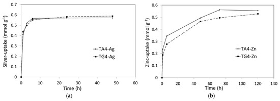 Uptakes of (a) Ag+ ions and (b) Zn2+ ions by tobermorite products TG4 and TA4.