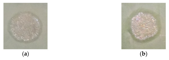 Images of clear zones around discs (10 mm in diameter) of CTA-Ag in contact with (a) E. coli and (b) S. aureus.