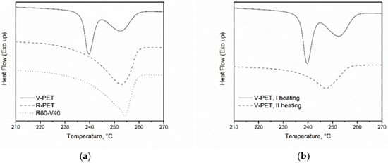 Melting peaks of V-PET, R-PET and R60-V40 observed during the first heating at DSC (a). Melting peaks of V-PET during first and second heating (b).
