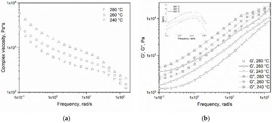 Dependence of complex viscosity (a) and storage and loss moduli (b) of R60-V40 from the frequency at 240, 260, and 280 °C.