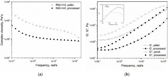 Dependence of complex viscosity (a) and storage and loss moduli (b) of R60-V40 in the form of pellet and processed from frequency at 280 °C.