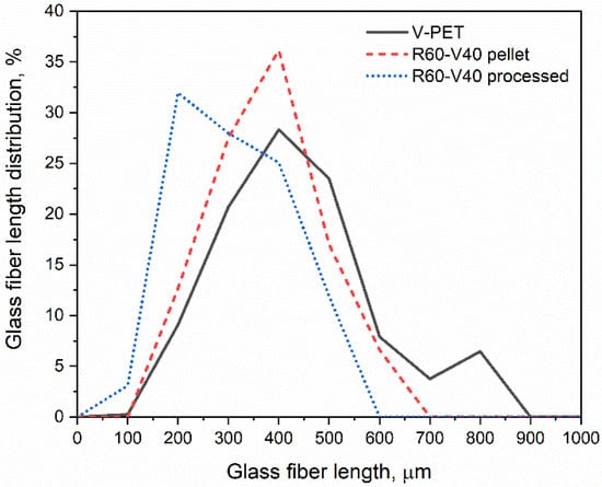 Glass fiber length distribution in V-PET, R60-V40 pellet, and R60-V40 processed.