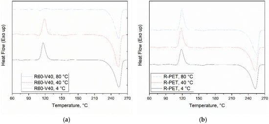 Thermograms of R60-V40 (a) and R-PET (b) molded with different mold temperatures.