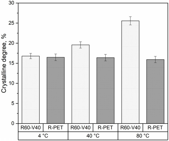 Crystalline degree of R-PET and R60-V40 molded at different mold temperatures.