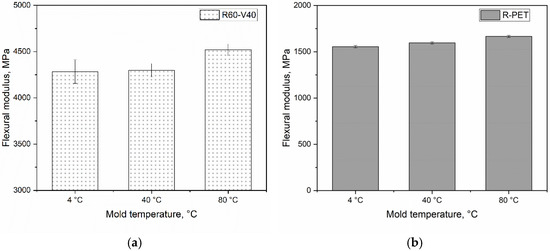 Flexural modulus of R60-V40 (a) and R-PET (b) molded at different mold temperatures.