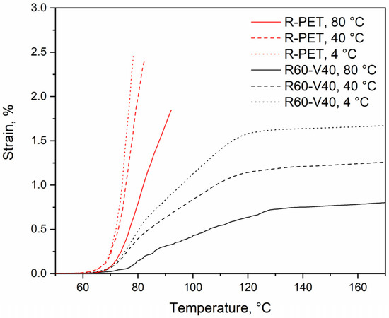 Dependence of the strain from the temperature of R-PET and R60-V40 molded at different molding temperatures.