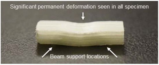 Based on the literature on carbon fiber/epoxy laminates, it would then seem reasonable to investigate consolidation quality and void content in additively manufactured unidirectional continuous fiber-reinforced thermoplastic composite beams using short beam shear (SBS) testing as described in ASTM D2344 [14]. Unfortunately, in previous efforts carried out by the authors, all relevant SBS tests of unidirectionally reinforced thermoplastic matrix composites resulted in inelastic failures, where the specimen permanently deforms, as seen in Figure 1, but does not show catastrophic interlaminar shear failure. The SBS test results were insensitive to the measured thermoplastic matrix void content, showing no consistent trend in SBS strength over a range of 2–6% void content and, as a result, short-beam strength is an ineffective indicator of composite quality when inelastic failure occurs [15].