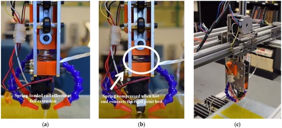 Spring-loaded end effector (a) at full extension (b) under compression in contact with the rigid print bed and (c) mounted on the 3-axis gantry system.
