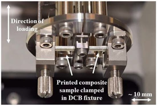 Printed composite sample in the double cantilever beam fixture relevant to this work.
