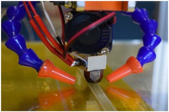Once relevant layer geometry (width and thickness) was developed empirically, in a method consistent with the earlier work, displacement control in the build direction (Z) allowed for the application of a near constant consolidation force during processing. Near constant consolidation force during processing is possible by means of programmed spring displacements that far exceed any small variations in the displacement of the spring as the print head moves across any irregularities in the surface of the sample. Using programmed spring displacements in the range of 1–2 mm, and assuming small variations in the displacement of the spring during printing (<0.1 mm), total force variation was assumed to stay within the realm of ~1 N. In early proof-of-concept testing of the spring-loaded end effector, no spring movement during printing was visible; therefore, the assumption of negligible variations in the displacement of the spring during printing was deemed tenable [15]. Consistent consolidation pressure during a multilayer build is achieved by lifting the end effector an amount equal to the layer thickness as each subsequent layer is applied. Two adjustable cooling ducts, oriented to point at the tip of the nozzle, are shown in Figure 3. Cooling ducts, which supplied compressed air, were included in the design of the spring-loaded end effector as a means of quickly rigidizing the commingled material after deposition on the print bed.