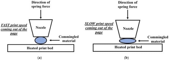 As a result of printing the samples at varying print speeds, analogous to varying the time under consolidation pressure, the nominal sample thickness increased as a function of increasing print speed. This is a trend consistent with other works in the literature [17,18]. This trend is intuitive under the assumption that the viscous flow of the thermoplastic polymer in the commingled material, in the low viscosity state experienced during processing, occurs almost entirely due to mechanical force applied by the spring-loaded end effector via the heated nozzle. This implies that the slower print speeds, with all other parameters held constant, will generally correspond to thinner samples. A slow print speed provides a longer period of time for the low viscosity polymer to flow laterally away from the nozzle outlet. Consequently, the changes in sample thickness with print speed were accompanied by changes in the sample width. As the thickness of each ply increased with increasing print speed, the width of the ply decreased accordingly. This concept is illustrated graphically in Figure 6, where under otherwise equal processing parameters, Figure 6a correspond to higher print speeds and less consolidation. In comparison, Figure 6b is indicative of lower prints speeds.