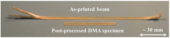 Specimen cross-section dimensions were measured with a digital micrometer. Four measurements of specimen width and thickness were taken along the length of the beam and averaged. An example of an as-printed beam specimen compared to a post-processed DMA specimen is shown in Figure 7. The average dimensions of each group of DMA specimens (seven total groups, each composed of six specimens), separated by print speed, are reported in Table 1.