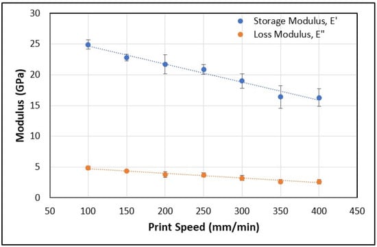 A total of 42 beam specimens were evaluated in the DMA. The maximum measured storage modulus (E’), loss modulus (E”), damping factor (tan δ) and the glass transition temperature (Tg) were determined from the DMA output for each of the six specimens belonging to each of the seven print speed-based specimen groups. The average of the maximum measured moduli from the 1Hz frequency sweep and the associated standard deviations are plotted against print speed in Figure 8. The damping factor, tan δ, is plotted against print speed in Figure 9, and the glass transition temperature (Tg), measured from the peak of E”, is correspondingly plotted against print speed in Figure 10. The values of the standard deviation are shown as error bars in each chart.