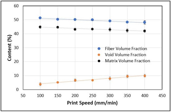 Fiber, matrix and void content versus print speed.