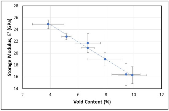 Storage modulus, E’, versus void content.