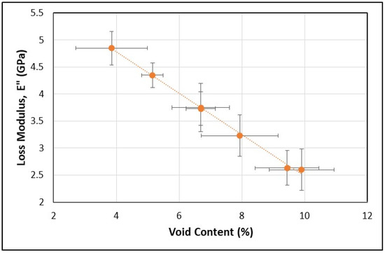 The average of the maximum value of the measured loss modulus, E”, was also determined for each of the seven print speed specimen groups along with the associated standard deviations. In this research, the maximum measured loss modulus was observed in the glass transition region of the DMA temperature sweep and can also be used as an indicator of the glass transition temperature [20,23]. More generally, the loss modulus serves as a representation of the ability of a polymer to dissipate strain energy as heat through internal motions. In consideration of the relevant DMA literature, it is not uncommon for studies to report differences in the maximum measured loss modulus for the same temperature at which the maximum E” is measured; however, it is uncommon to see commentary on the significance of the magnitude of E” at its maximum value in the DMA scan. Similar to the format used to present the measured average maximum storage modulus as a function of void content, the measured average maximum values of loss modulus, with associated sample standard deviations, are presented against void content in Figure 14.