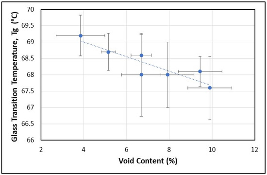 Finally, it is important to consider how the glass transition temperature, Tg, as measured from the maximum loss modulus, E”, varies with void content, as shown in Figure 16. Despite the seemingly small range of measured glass transition temperature across the approximately 6% increase in void content, as well as the relatively large sample standard deviations, the negative trend shown in Figure 16 is tenable based on the first (graphically the left-most data point) and last (graphically the right-most data point) data points coupled with their associated standard deviations, which do not overlap. In the relevant literature, it is common to record variations in Tg as a function of small changes to a material that is subjected to dynamic mechanical analysis [7,18,23,24]. Furthermore, the two most relevant articles to this work reported clear shifts in Tg to lower temperatures, with decreased interfacial contact between the constituent reinforcement and matrix as well as increased void content (i.e., manufacturing defects) [7,18].