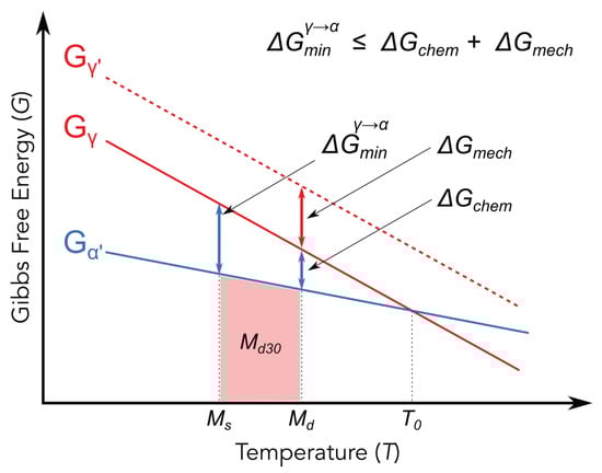 When undergoing plastic deformation, the additional mechanical energy () coming into the system results in an increased free energy difference between the deformed austenite phase (Gγ′) and that of the austenite phase (Gα′) at a given temperature. This greater difference increases the probability of the transformation to occur at a temperature higher than M, referred to here as the martensite deformation temperature M.