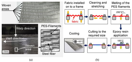 Figure 3b illustrates the fabrication process for the steel plies. After weaving the PES filaments, the fibers were fixed onto a frame and stretched to ensure a parallel fiber orientation. The PES fibers were then dissolved by heating to 250 °C, followed by the pressing and curing of resin films on both sides of the ply at 130 °C. The hardened plies were then cut to the required size and used on the top and bottom layers using the aforementioned autoclave process. The MCFRP laminate plates were fabricated in the same lateral size as that of the CFRP plates, with a thickness of