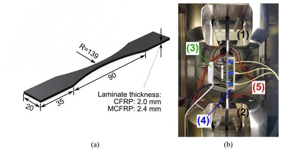 The laminate plates were cut into dog-bone shaped samples using a Daetwyler Microwaterjet (Bleienbach, Switzerland), measuring 160 mm in length with a grip-area of 20 × 35 mm as illustrated in