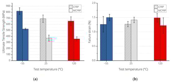 The CFRP and MCFRP samples were tested under tensile and fatigue conditions at three different temperatures; −55, 25 (RT) and 120 °C. Tensile tests were used to determine the ultimate tensile strength of the samples, based upon which the fatigue tests were carried out. Fatigue testing under increasing load–amplitude (ILA) conditions was carried out to gauge the materials’ response to different loads at different temperatures.