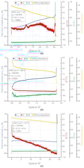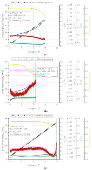 Figure 9 show representative results from CLA tests of CFRP and MCFRP samples, respectively, alongside the simultaneous recording of the change in the sample temperature (ΔT) and electrical resistance (ΔR) due to fatigue.