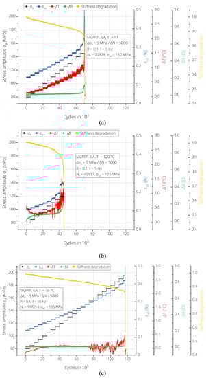 Increasing load–amplitude tests were performed for both composites at each temperature point using the data obtained from the monotonic experiments. Each ILA test was carried out at a step-wise increasing stress-amplitude of 5 every to cycles per step (ΔN). The experiments at RT and 120 were done at a loading frequency of 5 , whereas the tests were performed at 10 . The upper limit of was set to the ultimate tensile strength (UTS) observed for each material and temperature.