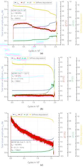 Section 3.5). These total strain–amplitude and stiffness degradation trends hold for all three test temperatures and are an indicator for the better fatigue performance of MCFRPs.