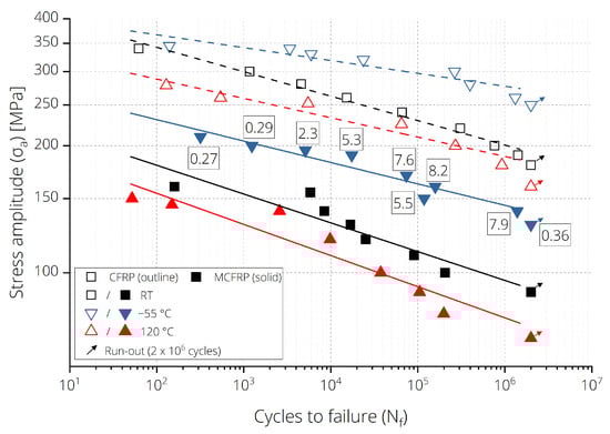 ) as well as higher fatigue strengths at lower temperatures. The difference in the stress amplitudes between the CFRP and MCFRP arose due to the lower number of 0° CF layers in the MCFRP samples. Comparing the