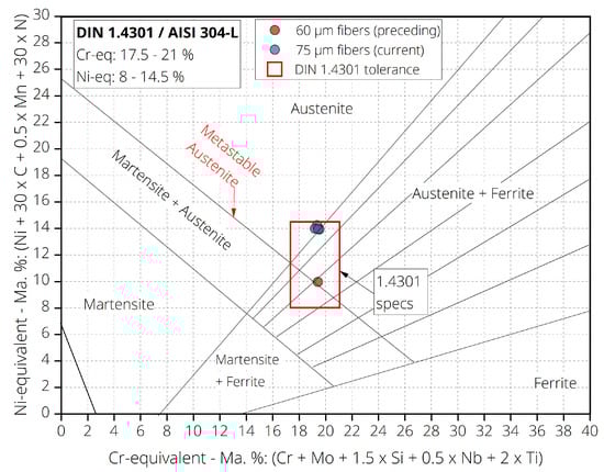 Figure 11 that, although the steel fibers used in both studies fall under the constraints of the DIN 1.4301 standard, they differ significantly from each other in their nickel-equivalent content. This equivalency is dependent additionally on the carbon, manganese and nitrogen content found in the fibers. The chemical makeup of the fibers used in the prior study, marked red, lie on the boundary of the austenite and the martensite+austenite phase, which resulted in their metastability at room temperature and below. In contrast, the four fiber batches analyzed during this study had higher Ni-equivalent content and lay on the boundary of the austenite and austenite+ferrite phases.