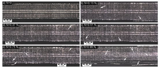 The damage initiation and propagation differences between CFRP and MCFRP, observed during the tests under constant load–amplitudes can be confirmed in the microscopic images. The damage initiation and propagation occurs significantly later for the MCFRP due to the ductility of the steel fibers. When comparing the two composites right before failure (N = 99%·N), the MCFRPs exhibited greater damage in the form of delaminations and fiber breakages, which resulted in comparatively less brittle failure behavior.