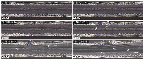 Figure 13. During the first stage, no micro-cracks could be observed in the sample cross-section (N = 10 %), which confirms the significantly lower fatigue softening observed in these samples during the CLA tests. Visible damage can be observed only after the half-way mark of the fatigue life. This included CF layer delaminations as well as debonding and expulsion of some 90° steel fiber layers at N = 72%·N