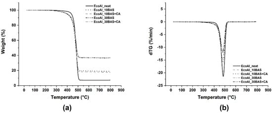 (a) TG and (b) derivative (dTG) curves for all EcoAllene-based formulations.
