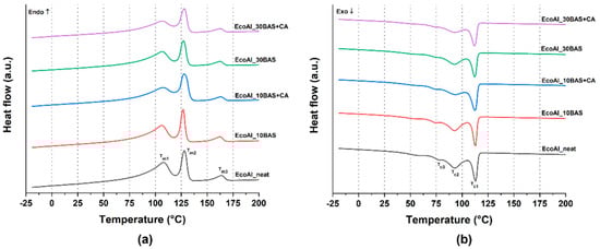 DSC 2nd heating scan (a) and cooling scan (b) for EcoAllene-based composites.
