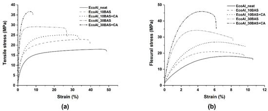 Representative (a) tensile and (b) three-point bending curves of EcoAllene-based composites.