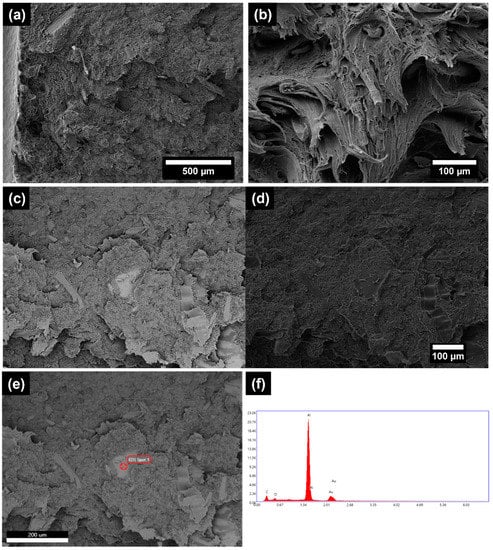 SEM micrographs of unfilled EcoAllene: (a,b) after Charpy impact test; (c,d) after tensile test. (c) shows the backscattered signal, while (d) the secondary signal; (e) after tensile test in backscattered signal and (f) EDS (Energy Dispersive X-ray Spectroscopy) spectrum.