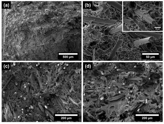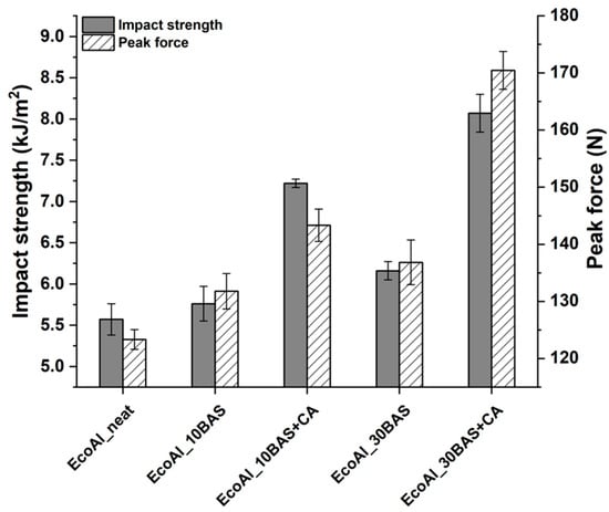 Dynamic properties were investigated by performing Charpy impact tests on notched samples, whose results are summarized in Figure 7 in terms of impact strength and peak force. The morphology of fracture surfaces is included in Figure 4a,b, Figure 5a,b, and Figure 6a,b for unfilled EcoAllene, EcoAl_30BAS and EcoAl_30BAS+CA, respectively. The notch is visible on the left side of the corresponding micrographs at lower magnification. The poor impact strength of neat EcoAllene was increased by the addition of basalt fibres, reaching a maximum improvement at 30 wt.% of basalt fibres equal to 11% and 45% for formulations without and with the coupling agent, respectively.