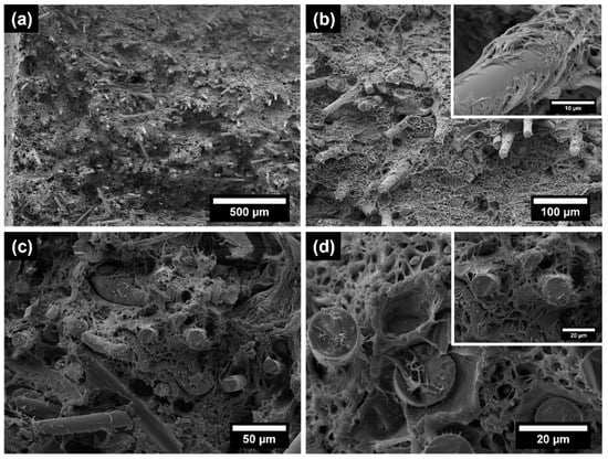 Unreinforced EcoAllene featured poor mechanical properties, in terms of stiffness and strength, which are mostly ascribed to the low-density polyethylene. These results are in line with other studies [,], though the stiffness appears to be lower in the present case, likely due to a reduced amount of aluminium flakes which do not restrict to a great extent the polymer chains’ mobility. As previously mentioned, aluminium content was found to be around 7.5 wt.%, lower than the usual amount of 15–20 wt.%. These poor mechanical properties were significantly improved by increasing the amount of basalt fibres, both in tensile and flexural loading. The tensile modulus increased by 165% and 755% as the basalt fibre content passed from 10 wt.% to 30 wt.% compared to unfilled EcoAllene, respectively, while the tensile strength improved by 27% and 67%. No decreasing trend with an increasing amount of basalt fibres was detected, at least in the range investigated in the present study. Ayrilmis et al. [] reported a reduction in tensile and flexural strength when moving from 40 wt.% to 60 wt.% of sawdust or rice husk flour. The significant improvements in mechanical properties reveal an efficient stress transfer at the basalt fibre/matrix interface, as confirmed by SEM observations reported in Figure 4 and Figure 5. Unfilled EcoAllene showed a ductile failure (Figure 4) and few aluminium flakes were found to be well embedded in the polymer matrix (Figure 4e,f). When basalt fibres were added, a reduction in macro-ductility was noted (Figure 3a), even if at the micro scale (Figure 5c,d), ductile failure was still observed. Pull-out phenomena are present, but the length of pulled-out basalt fibres is limited with evidence of matrix sticking on basalt fibre surface (Figure 5b), thus confirming a good fibre/matrix interfacial adhesion promoted by the basalt sizing designed for polyolefins. Sizing application does not produce a homogeneous coverage on fibres, thus leaving room for further improvements. In this regard, the addition of the coupling agent resulted not only in a significant reduction in ductility (Figure 6), but also in a stronger interfacial adhesion (Figure 6c,d), as the matrix is well adhered to the fibres which in turn appear to be mostly broken on the same fracture plane with very limited pull-out. This behaviour is due to the ester linkages created by hydrophilic OH groups reacting with acid anhydride groups from coupling agent. It is interesting to note that in bending, at the same level of basalt fibre content, the presence of the coupling agent is not detrimental to the strain at maximum stress. The coupling agent usually enables a better dispersion of fibres in the matrix, thus reducing the possibility of fibre clusters that can act as stress intensifier. The lack of stress amplification is especially important in bending, where the state of stress is complex including tensile, compression and shear.