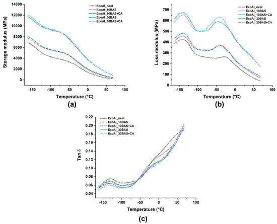 (a) Storage modulus, (b) loss modulus and (c) tanδ curves as a function of temperature for all EcoAllene-based composites.
