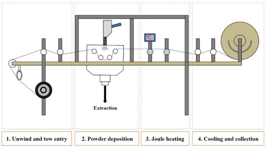 - Powder–epoxy is electrostatically charged and sprayed on the carbon fibre tow as it moves.