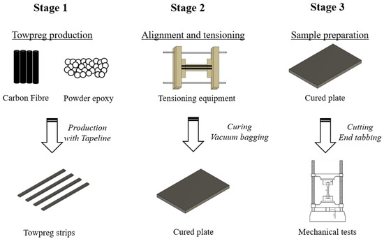 For further mechanical characterisation tests, unidirectional carbon fibre composite (UD-CFRP) plates were manufactured from the produced powder epoxy towpreg strips. Composite plate production consisted of the following stages, as shown in Figure 2: