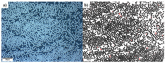 Voids are one of the main manufacturing defects in composites, influencing the mechanical properties considerably by acting as failure initiation points [17]. The tensile, compressive, flexural, and interlaminar shear strength of the composites are adversely affected by the voids [18]; moreover, fatigue life deteriorates seriously [19]. The spatial distribution of the voids is a key factor for the performance of the composite. In the presence of voids at the fibre–matrix interface, adhesion between the fibre and matrix is weakened, and load transfer is impaired [20]. As it is dominated by the properties of matrix and matrix–fibre interface [19], interlaminar shear strength is susceptible to the interfacial voids in particular. For the samples that were produced at different production speeds, interfacial void content was determined using ImageJ and a custom LabVIEW algorithm. Using the samples analysed by the Zeiss Axioskop 2 MAT model microscope, ImageJ was used to find geometric information on the fibres, matrix, and voids. Data for all samples was exported to a csv file. This included information on the locations of the fibres and voids, the maximum diameter of each fibre (using a maximum calliper rule), and the area of the fibres and voids.