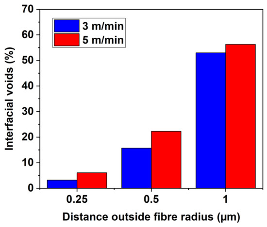 Results for the percentage of interfacial voids as a fraction of the total voids are shown below in Figure 7. Regardless of the search criterion (distance outside fibre radius), generally, a higher interfacial void content was found for samples produced at the higher speed of 5 m/min. The ratios of interfacial voids were 3.21% and 6.07% at 0.25 µm, 15.9% and 22.3% at 0.5 µm, 53.01% and 56.29% at 1 µm distance outside fibre radius at 3 m/min and 5 m/min production speed, respectively. The higher interfacial void ratio at the higher production speed (i.e., higher FVF) was attributed to the lesser resin content within the towpreg compared to 3 m/min production speed samples.
